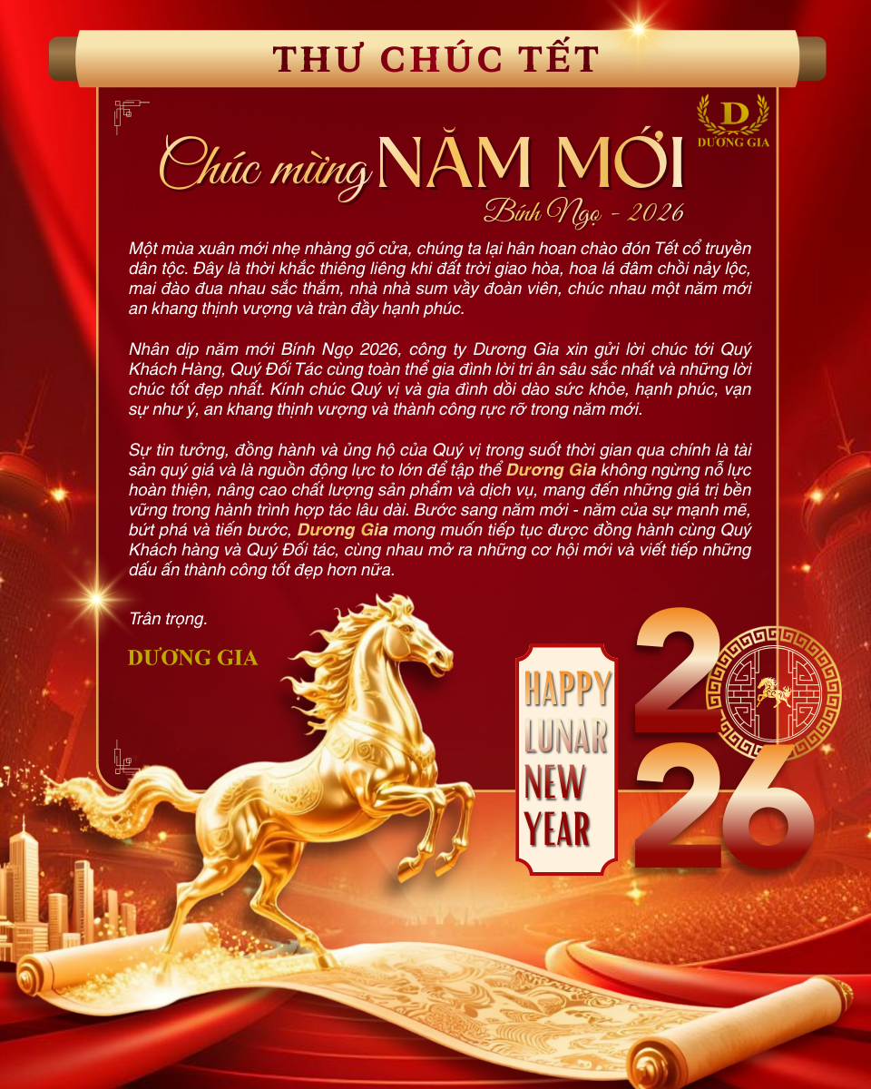 Xuân mới đã về, mang theo sắc thắm của mai đào và niềm hân hoan sum vầy. Trong không khí rộn ràng của Tết cổ truyền, Công ty Dương Gia xin gửi đến Quý Khách Hàng, Quý Đối Tác cùng gia đình lời tri ân chân thành và lời chúc năm mới tốt đẹp nhất.