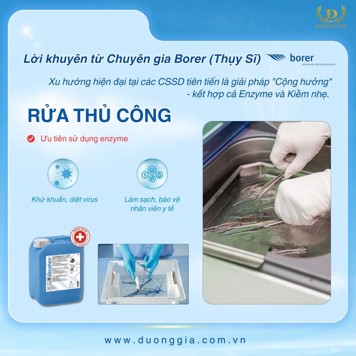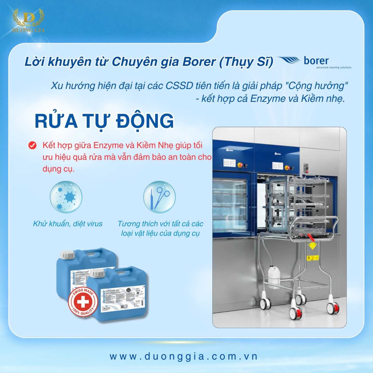 Theo lời khuyên từ Chuyên gia Borer (Thụy Sĩ): hiện nay, xu hướng hiện đại tại các CSSD tiên tiến là giải pháp "Cộng hưởng" - kết hợp cả enzyme và kiềm nhẹ: