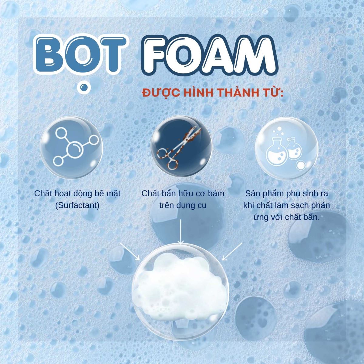 -> Bọt là không khí, nó sẽ ngăn cản hóa chất làm sạch tiếp xúc hiệu quả với bề mặt dụng cụ, làm giảm đáng kể khả năng loại bỏ chất bẩn.