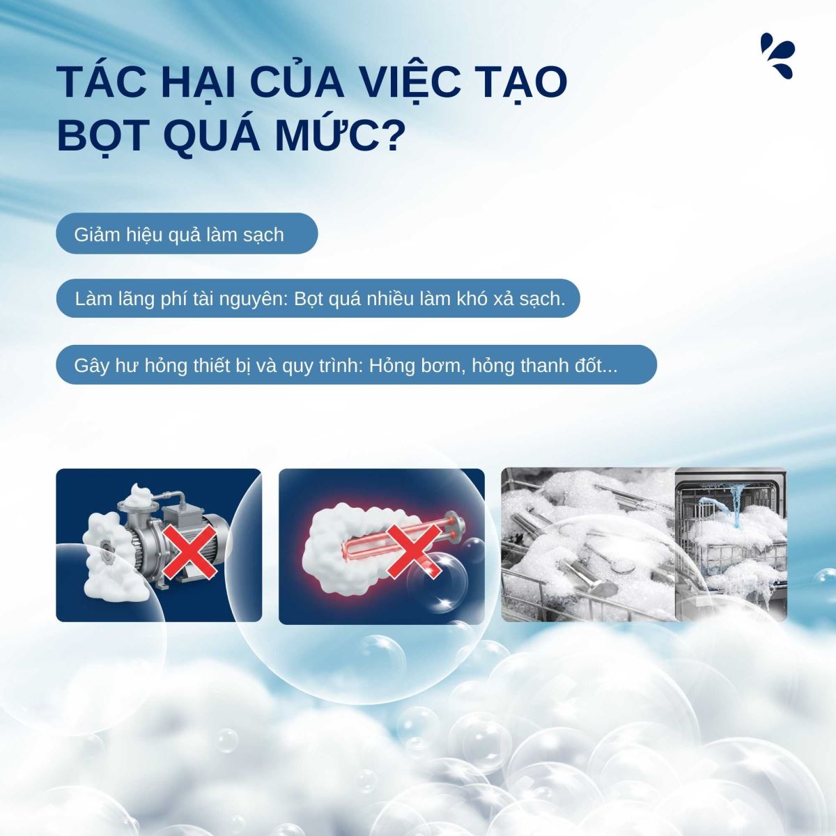 • Lỗi hệ thống: Bọt nhiều dễ dẫn đến báo lỗi máy rửa liên tục, làm gián đoạn chu trình tái xử lý.