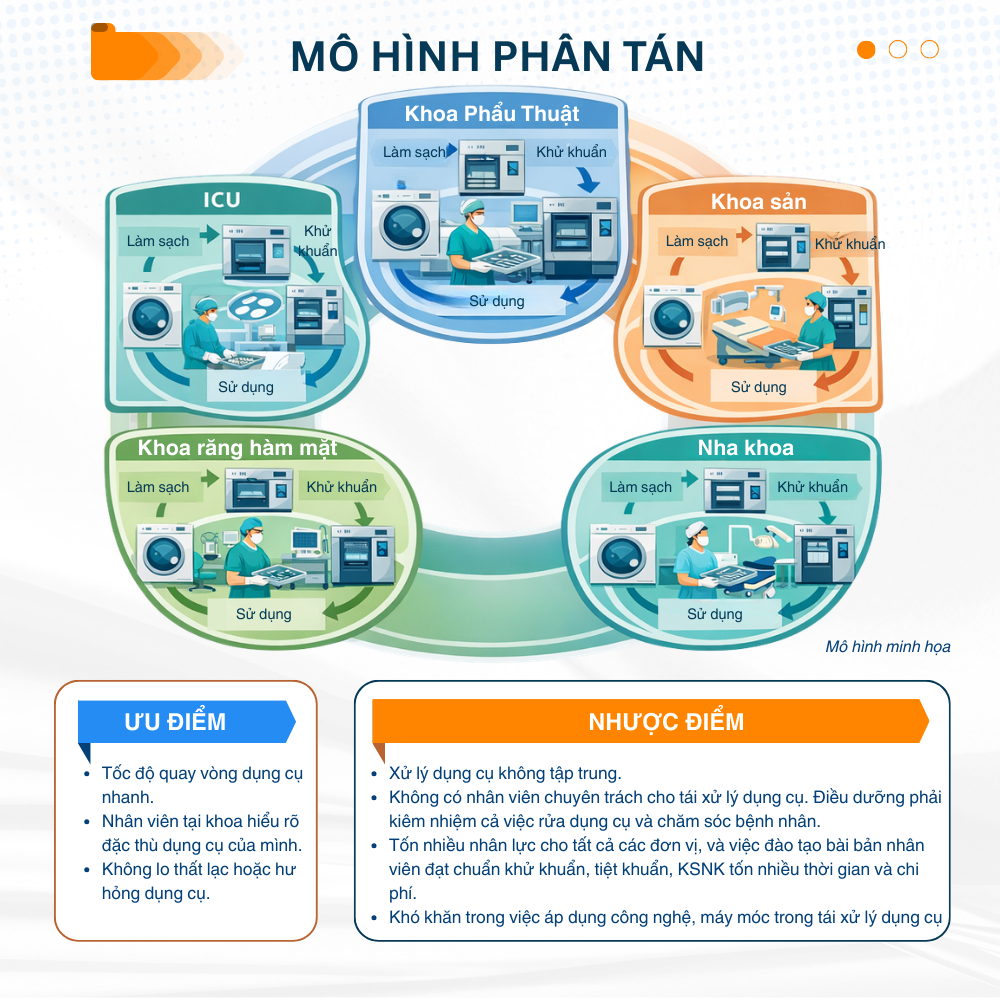 Trong mô hình phân tán, dụng cụ y tế được làm sạch, khử khuẩn và tiệt khuẩn ngay tại từng khoa riêng biệt (Khoa Phẫu thuật, Khoa Sản, Khoa Răng Hàm Mặt…). Mỗi khoa tự tổ chức khu vực và quy trình xử lý dụng cụ phục vụ cho hoạt động chuyên môn của mình.