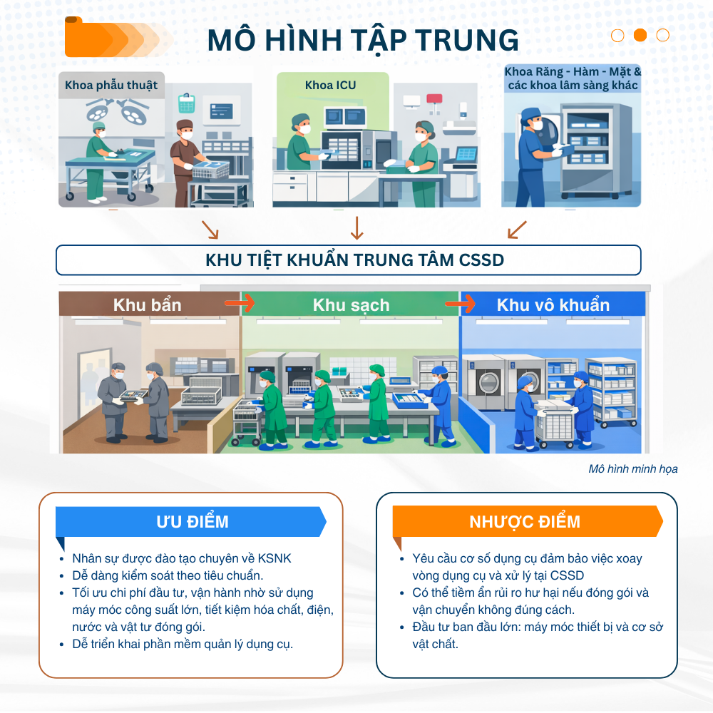 Mô hình tập trung được xem là tiêu chuẩn hiện đại trong kiểm soát nhiễm khuẩn. Toàn bộ dụng cụ y tế sau sử dụng từ các khoa/phòng được vận chuyển về một đơn vị CSSD trung tâm duy nhất. Tại đây, dụng cụ được xử lý theo quy trình một chiều: tiếp nhận - làm sạch - khử khuẩn - kiểm tra - đóng gói - tiệt khuẩn - lưu trữ và cấp phát.