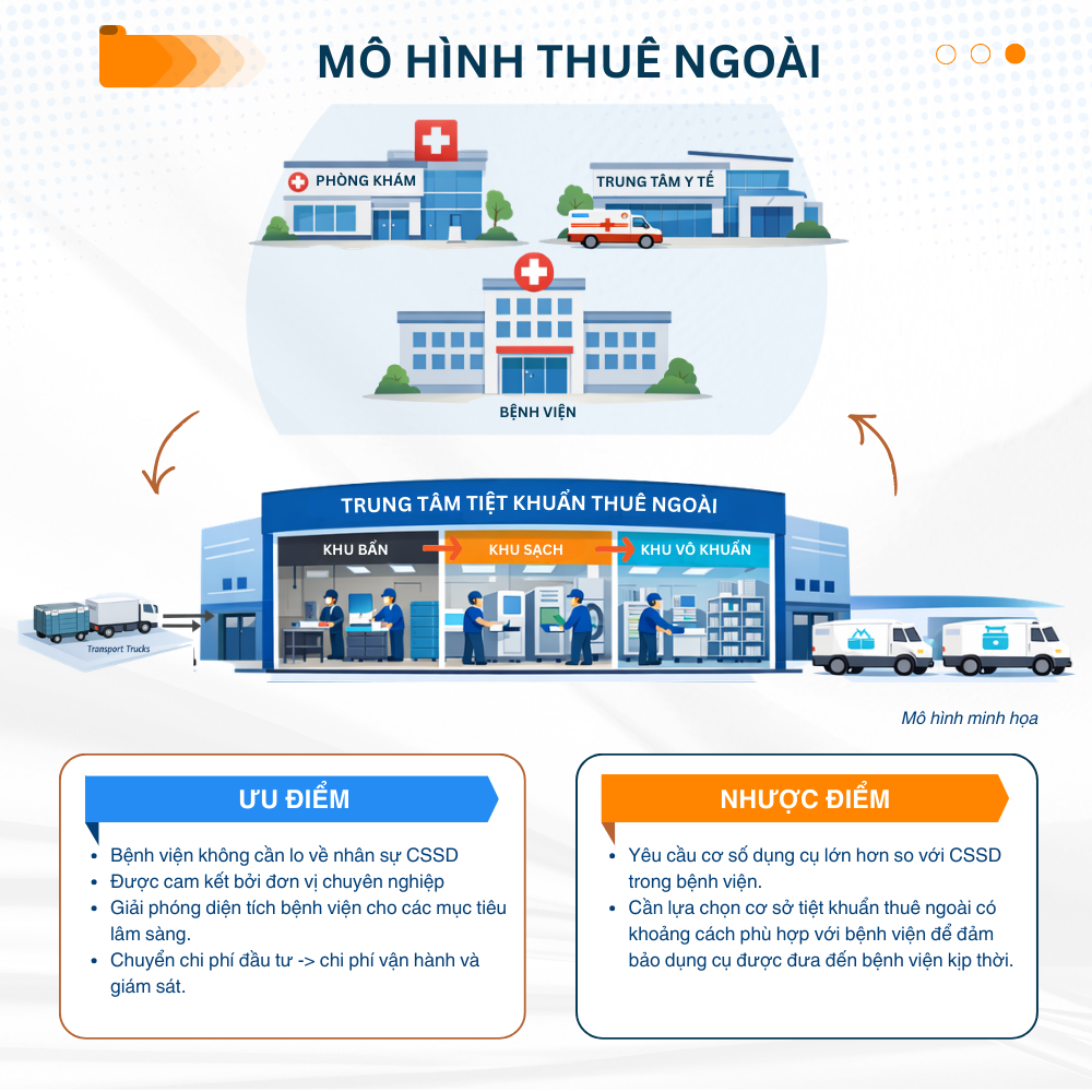 Bệnh viện ký hợp đồng với một trung tâm tiệt khuẩn độc lập bên ngoài. Bệnh viện chuyển dụng cụ bẩn đến một trung tâm tiệt khuẩn thương mại và nhận lại dụng cụ vô trùng sau 12-24h.