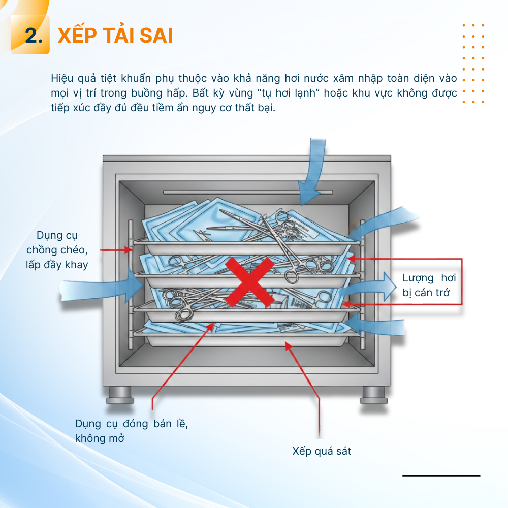 -> Việc xếp tải không đúng chuẩn là một trong những nguyên nhân phổ biến nhất gây thất bại tiệt khuẩn dù nồi hấp chạy hoàn chỉnh. Hơi nước không tiếp cận đủ bề mặt → vi sinh vật không bị tiêu diệt hoàn toàn.