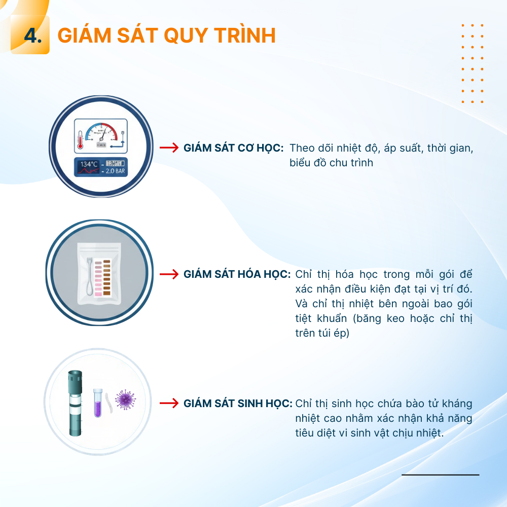 - Giám sát sinh học: Chỉ thị sinh học chứa bào tử kháng nhiệt cao nhằm xác nhận khả năng tiêu diệt vi sinh vật chịu nhiệt.